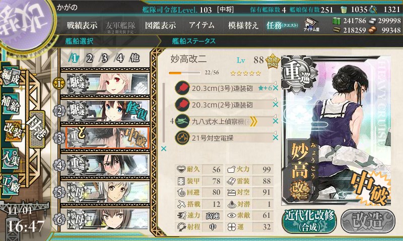 ルート固定には駆逐艦が2人と重巡が2人必要ということで夕立ちゃん、時雨ちゃん、妙高おねえさん、那智おねえさんのおなじみの4人を入れています。