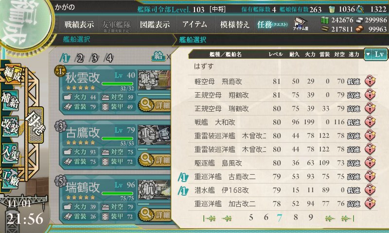 相手に戦艦がいるのでこちらに戦艦を入れなくても2回行動になるというのと、戦艦1+空母1にすると航空戦力があまり火力が出ないので。