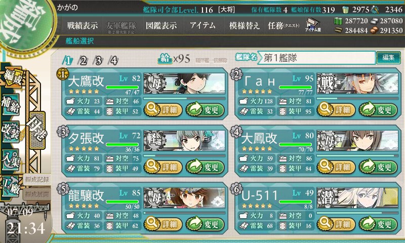 まずは4-5のほう。普段から戦艦1、航巡3、空母2で攻略しているのであまり変わらない感じ。