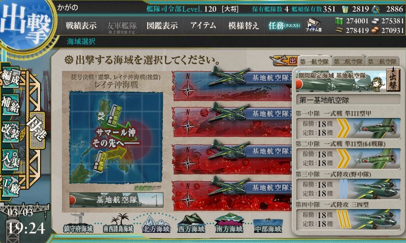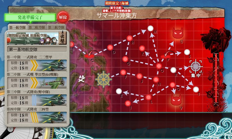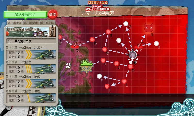 今回はIマスへ向けて出撃します。戦闘マスが全部で3つなので基地航空隊は各マスに1つずつ出しました。