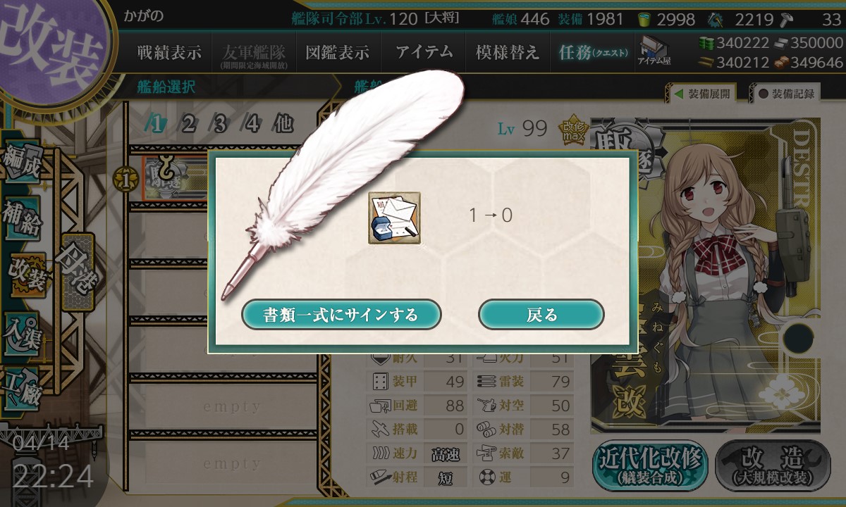 艦これの記録 2021/4/18 投稿日 2021年4月18日 著者 かがの カテゴリー 艦隊これくしょん -艦これ- 春イベントは連休があけてすぐっぽいですね。 だいぶ釘が回復してきました。 今週は3-5をクリアしました。 2-3で珍しい子がドロップしました。 今週は峯雲、鬼怒とケッコンしました。 現在の編成です。 ツイート