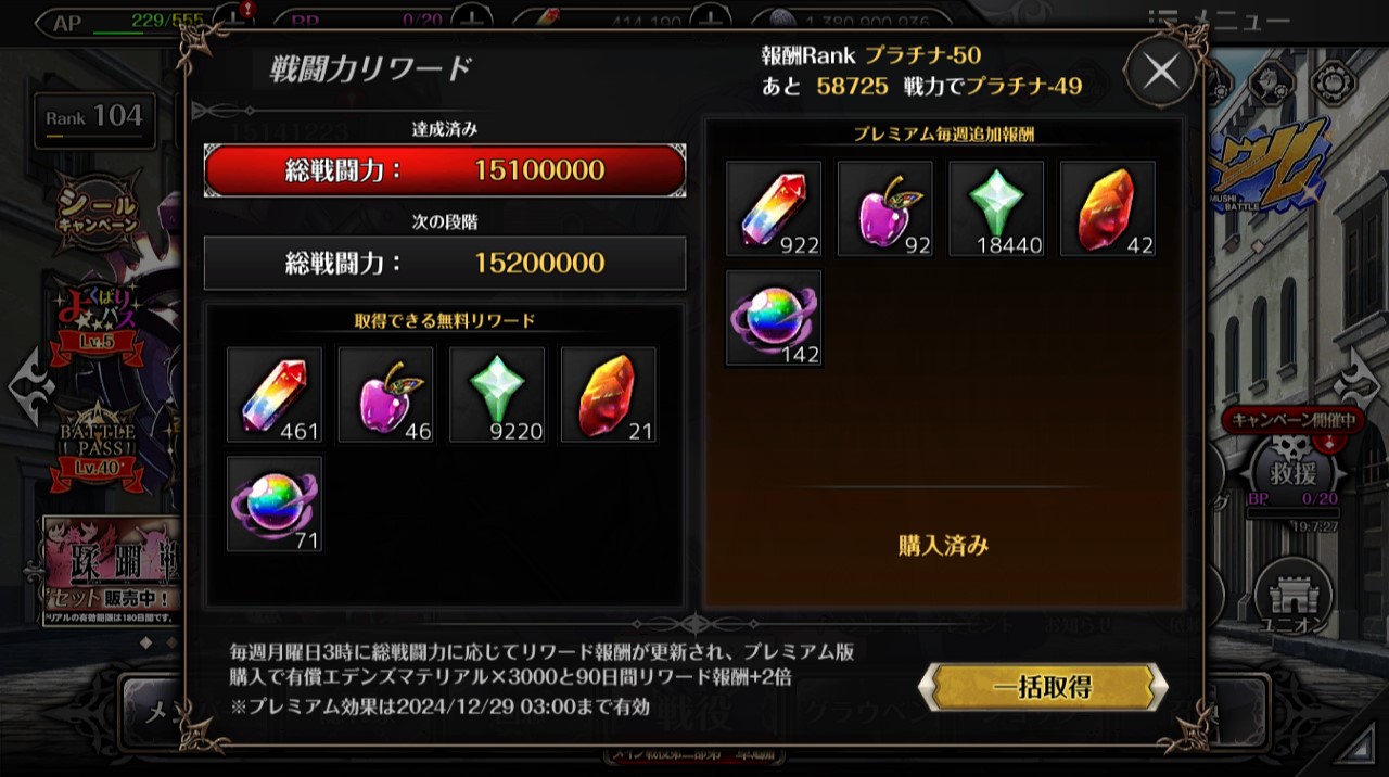 エデンズリッターグレンツェXの記録 2024/12/22 投稿日 2024年12月22日 更新日 2024年12月29日 著者 かがの カテゴリー エデンズリッター クリスマスイベが開催中です。 今週のプレゼントです。 無双バトゥルの記録です。 ラッシュバトゥルの記録です。 今週の戦闘力リワードです。 クリスマスのガチャです。 10連で☆5が3つも! 30連で終わりました。大変助かります。 ツイート