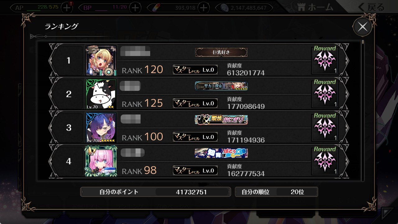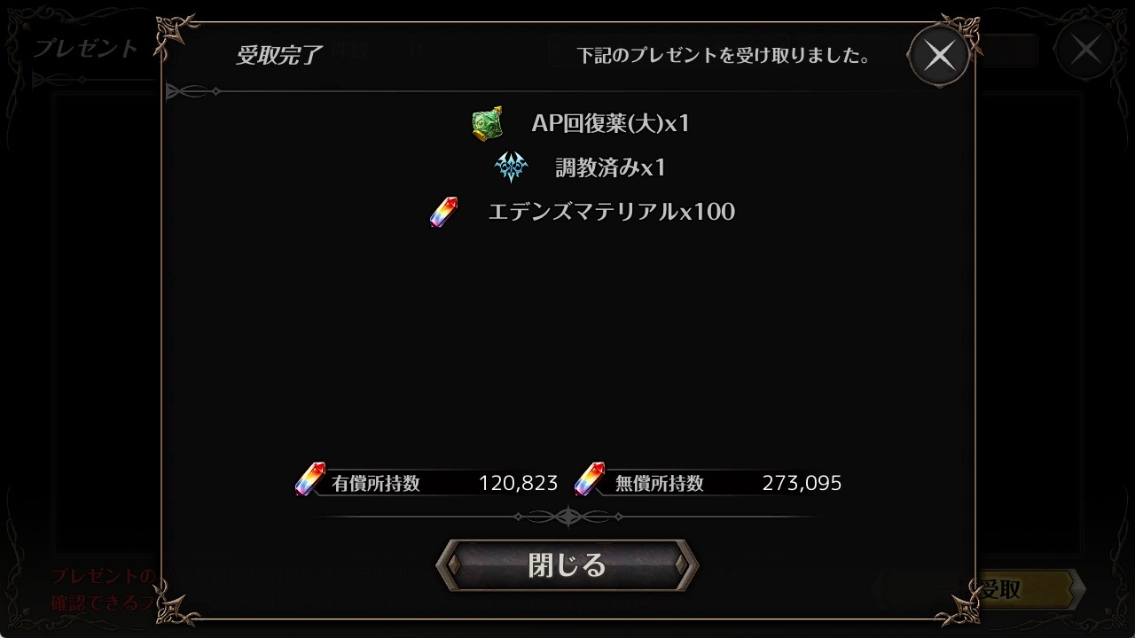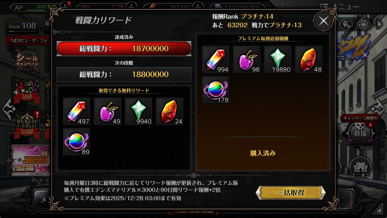 エデンズリッターグレンツェXの記録 2025/12/14 投稿日 2025年12月14日 著者 かがの カテゴリー エデンズリッター 塔イベが開催中です。 今週のプレゼントです。 コラボイベの結果です。 20位でした。 上位はこんな感じ。 今週の戦闘力リワードです。 集中訓練が開催中です。 ガチャです。 90連でした。 ツイート